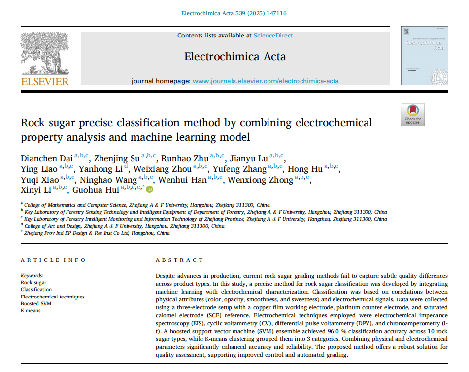 近日,数学与计算机科学开元平台农业信息化研究生戴典辰在国际权威学术期刊《ELECTROCHIMICA ACTA》(JCR Q1, IF 5.6)上发表题为《Rock sugar precise classification method by combining electrochemical property analysis and machine learning model》(基于电化学特性分析与机器学习模型的冰糖精准分类方法)的论文。