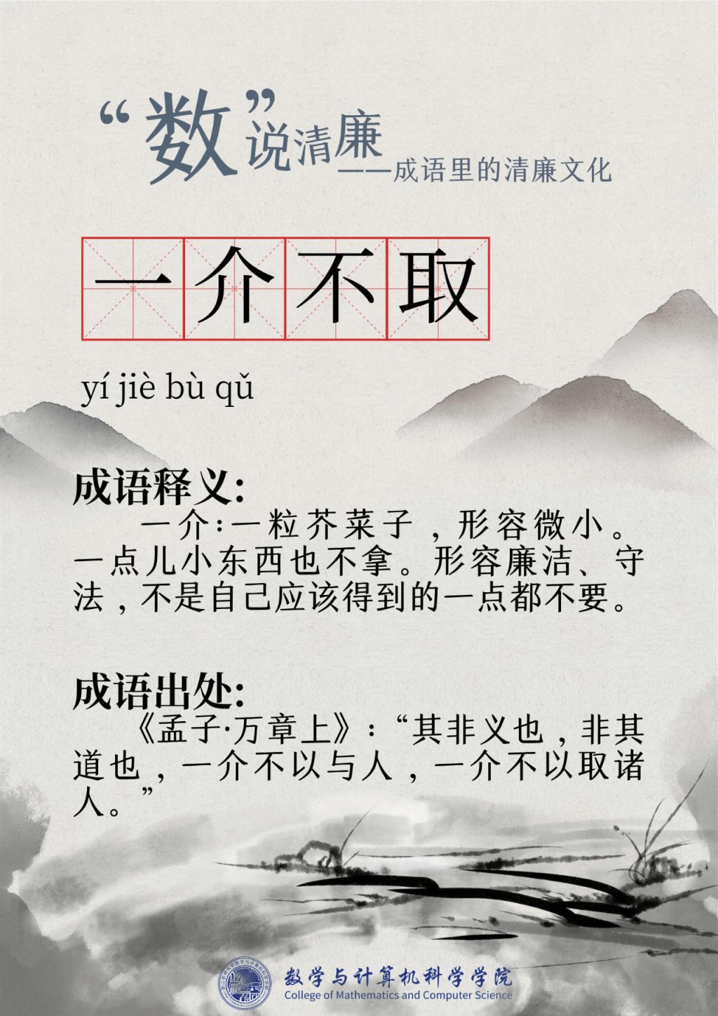 “廉洁”一词最早出现在屈原的作品“宁廉洁正直以自清”中。为人清廉正直从古至今都被视作立身处世最重要的品质之一。习近平总书记曾强调要“加强新时代廉洁文化建设涵养求真务实,团结奋斗的时代新风”。为深入挖掘中华传统文化中数字与成语诗词结合的廉洁要素,展现“廉洁”在中国传统文化瑰宝中浓墨重彩的独特地位,充分发挥清廉文化浸润校园、春风化雨的积极作用,数学与计算机科学开元平台现推出“数”说清廉——成语里的清廉文化系列文章,以传统文化之土壤培育清廉之花。