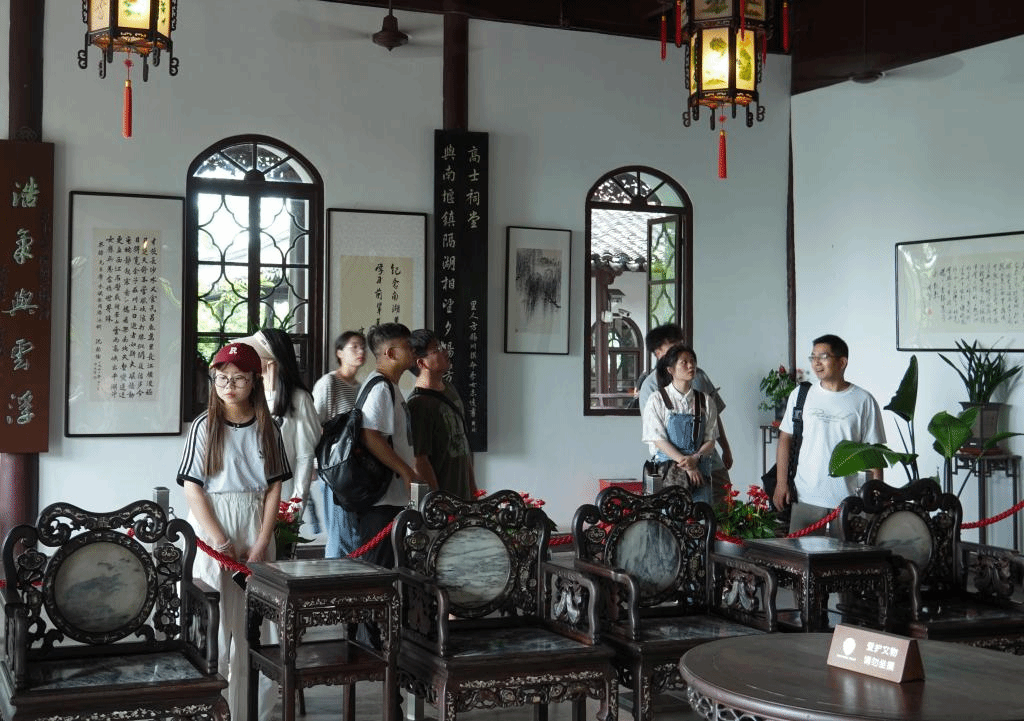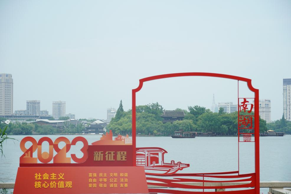 南湖湖心岛中央的烟雨楼,这里曾是中国共产党第一次全国代表大会的会议遗址,是中国共产党的诞生地。烟雨楼内陈列了大量的石碑、字画,撰写着历朝历代湖心岛的兴衰历程不仅记录了各朝代的国运兴衰,也象征着近代中国的抗争史以及新中国成立后的中国发展征程。