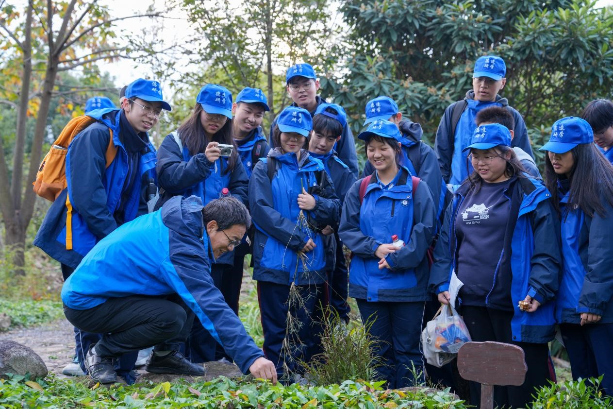 来自中药学专业的徐建伟老师是百草园的主要建设者,他对园内的所有植物都如数家珍。徐老师带领学生志愿者们为师生仔细地讲解了百草园里的每一株中草药的药性和功效,也耐心解答了同学们提出的各类问题。同学们纷纷感叹“老师和学长学姐们真厉害,认得那么多中草药”。