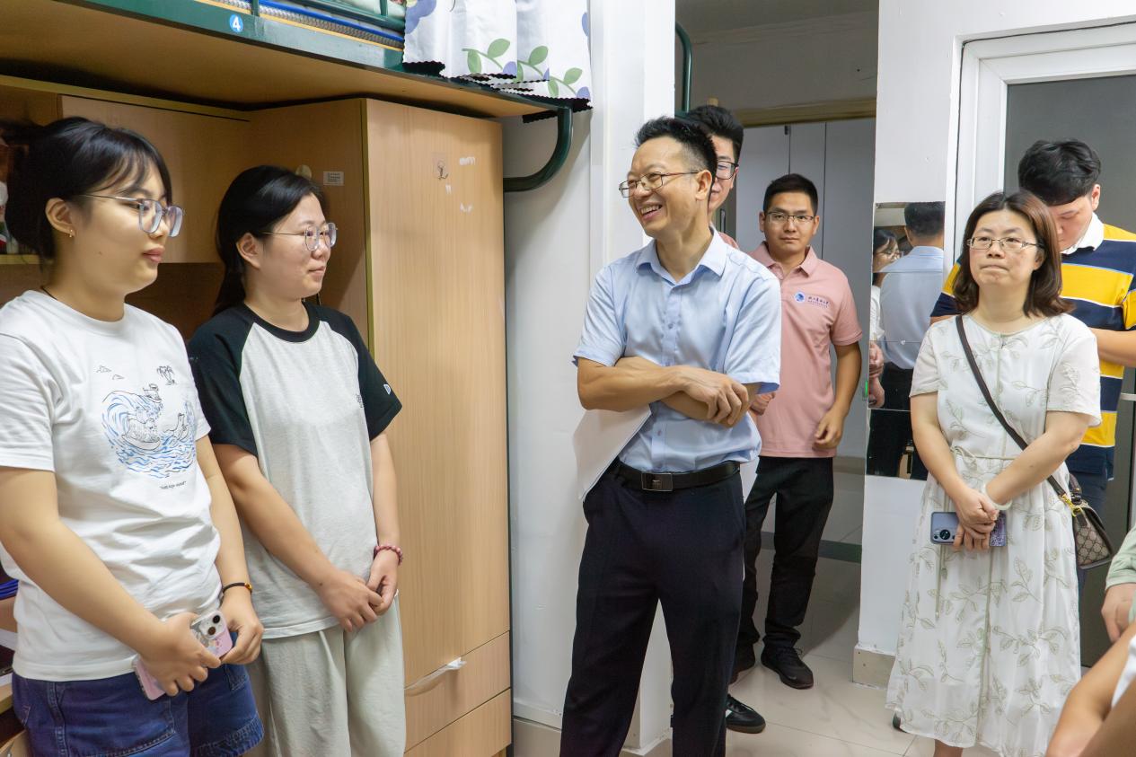 在走访过程中,何振波详细询问了学生们的入学入住情况,针对大学生活规划给出了建议。他强调,新生们应该尽快适应新环境,并制定明确的学习目标,为未来的学习道路打下坚实基础。黄萍通过轻松的拉家常方式拉近了与学生之间的距离。仔细询问了大家的兴趣爱好,鼓励新生们在学业之余,也要注重个人全面发展。张洪涛针对校园安全问题,提醒新生们要警惕电信诈骗,保护好个人信息和财产安全。胡军国针对研究生新生,提出了更高的期望,鼓励大家要多阅读、多发表学术论文,提高科研水平,为将来的学术研究和职业发展奠定坚实的基石。