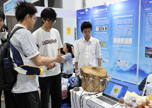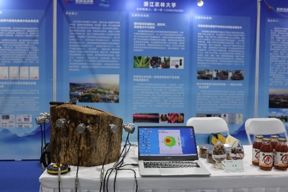 在大会高新技术成果交易会科创成果展区,冯海林教授团队通过实物展示和互动体验等多种形式,向参展领导和嘉宾全面展示了古树名木内部缺陷智能检测装备的技术优势和应用场景。该装备采用应力波技术对树木内部缺陷进行精准检测和可视化成像,可以提高古树名木保护的针对性和准确性,为实现古树名木“一树一策”、“对症下药”的精细化养护和精准化修复提供可靠的决策依据。