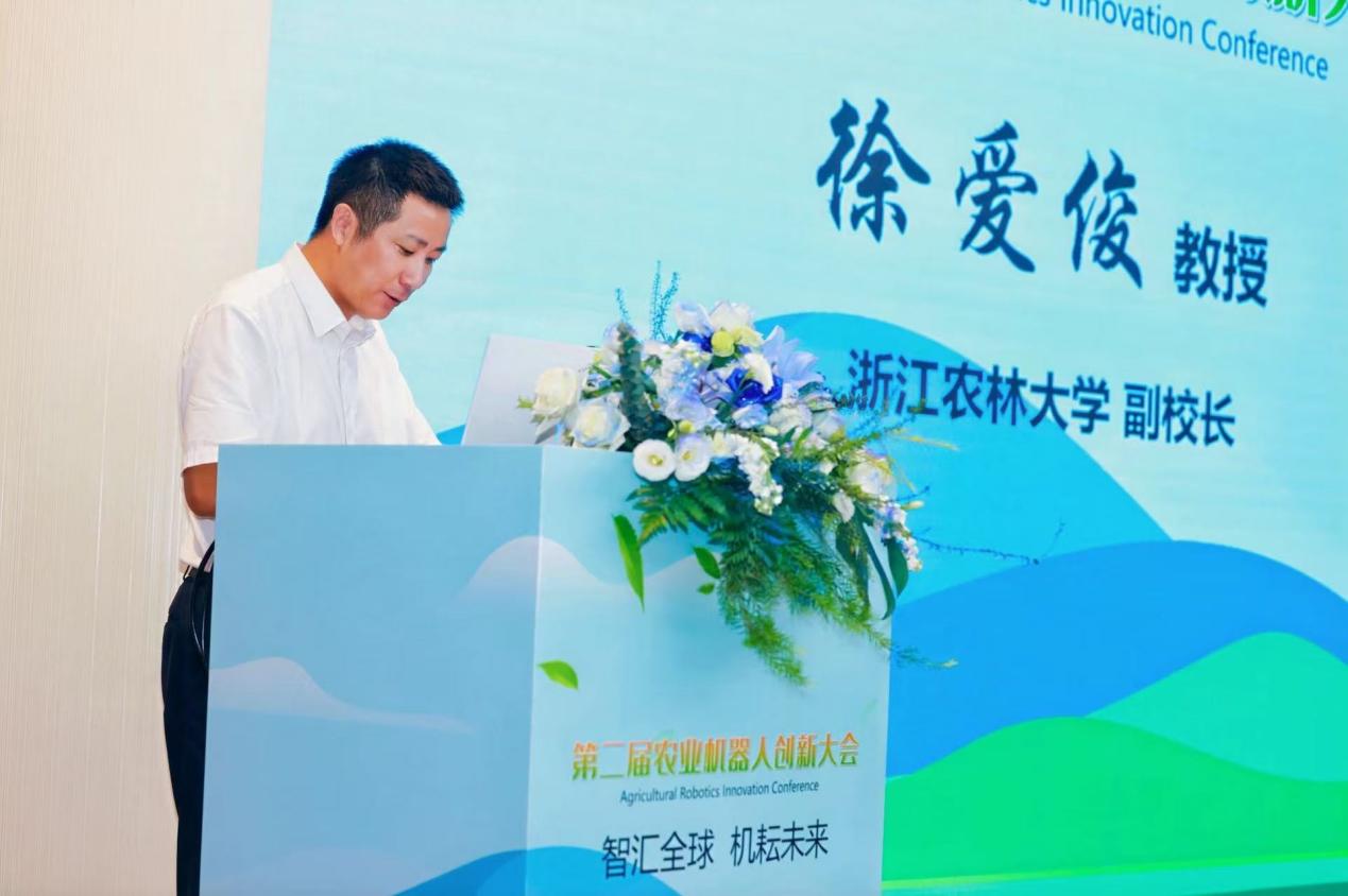 徐爱俊副校长代表我校进行开幕致辞。他简要介绍了浙江农林大学的基本情况。他表示,农业机器人技术是实现精准农业的核心驱动力,更是解决未来粮食安全、劳动力短缺等全球性挑战的关键突破口。农业机器人的发展不仅是学术的突破,更是产业创新的驱动力,学术界与产业界的融合将为未来的农业发展带来无限可能。浙江农林大学一直致力于推动智慧农业的研究与应用,期待此次会议能成为学者们碰撞创新火花的平台,催生更多兼具社会价值与实践意义的科研成果,为乡村振兴战略落地与农业高质量发展注入源源不断的智慧动能。