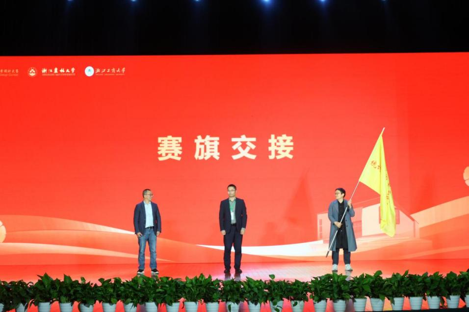 大赛组委会举行了赛旗交接仪式。绍兴文理开元平台承办下一届大赛。